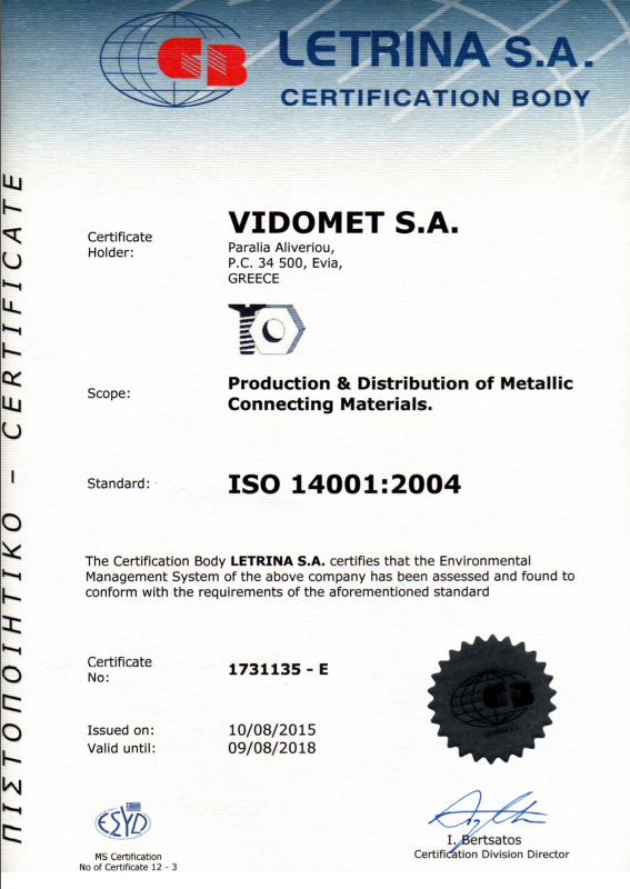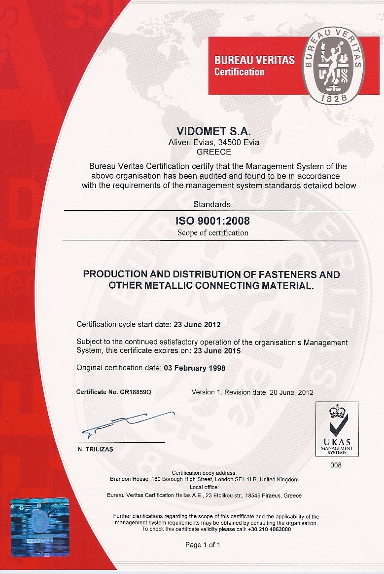 Already since February 1997 VIDOMET S.A. is holder of the ISO 9001 certificate, awarded by the internationally accredited organization «BUREAU VERITAS QUALITY INTERNATIONAL (BVQI).» (Renewed at 23/06/2012).
